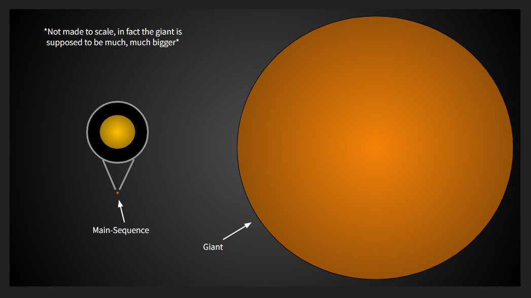 Following the main-sequence stage, the star will become a giant star, growing in size, luminosity, and mass. This is caused by the core running out of hydrogen to burn as it begins to use the hydrogen further out from its core. This process causes the star to grow, allowing its radius to expand up to 400 times larger than its original size. This growth occurs across a timeline of around 1 billion years before peaking in size. While at this peak, being a giant star, it will burn far more hydrogen than it used to while also gaining more mass. The giant will remain at this peak for no more than a few million years. This may seem like a lot, but when comparing it to the time it spent as a main-sequence star, it’s the blink of an eye.